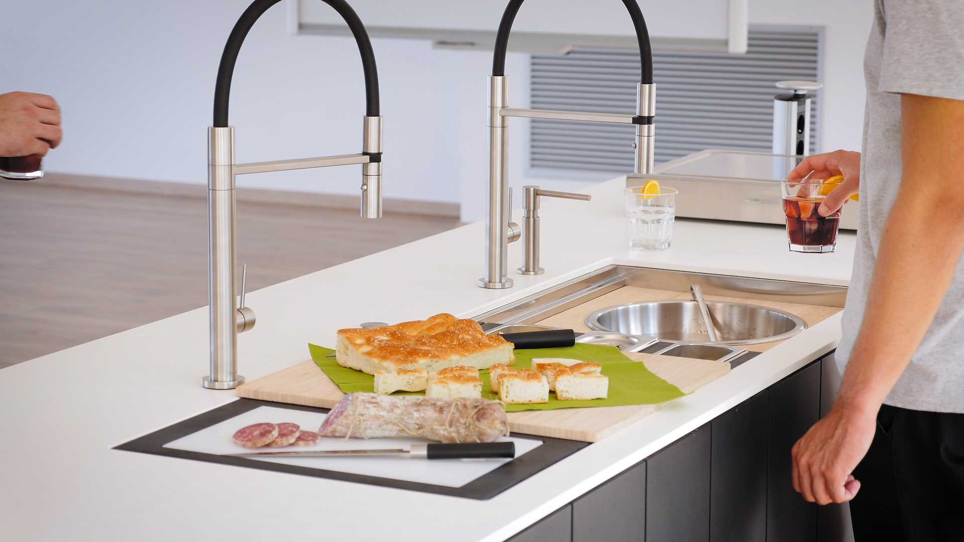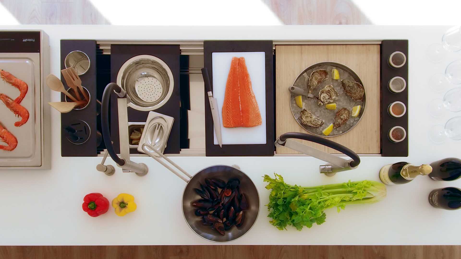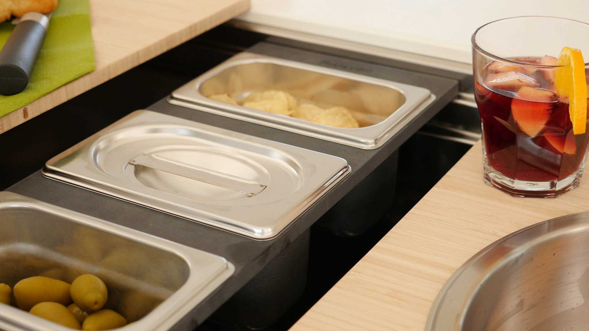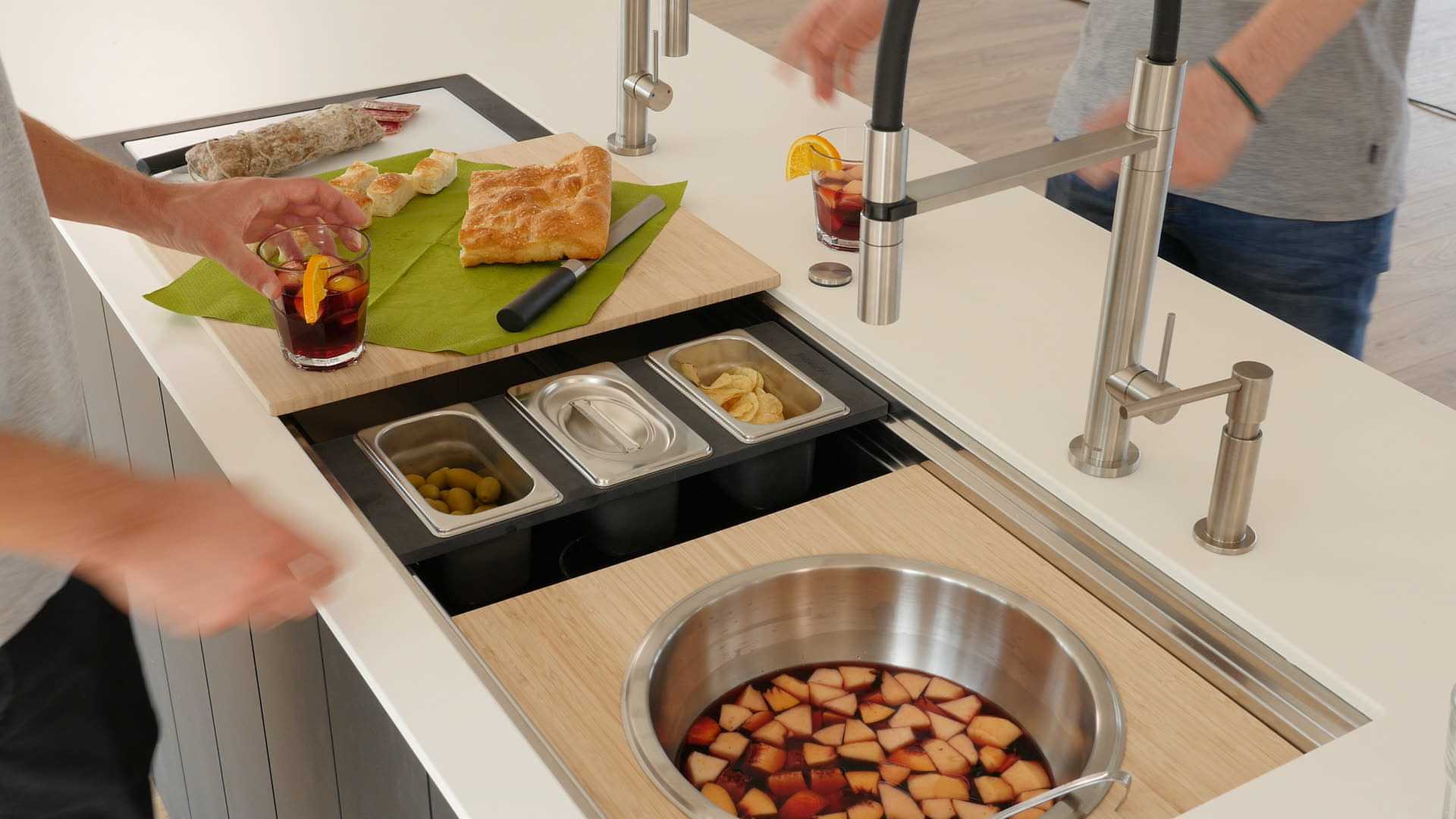 The functional center HappyHour moves the definition of sink towards new horizons. Thanks to its large kit of accessories, it is the focal point of your parties, aperitifs or finger-food dinners, and at the same time the perfect workstation for a real chef, able to appear and disappear at will under tis multi-layered accessories’ concept.